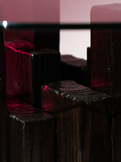 Base de composición constructiva de madera quemada con protección, vidrio de 10mm de espesor y topes de camplo duraluminio